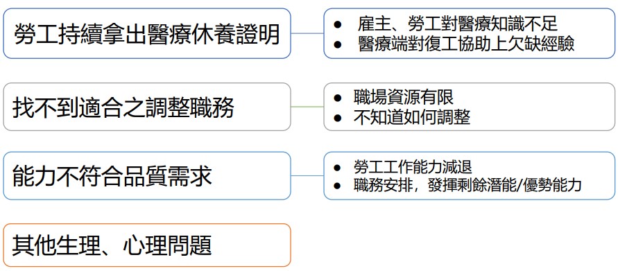 - 事業單位盡早介入復工,善用個管模式,有助於勞工提早復工。