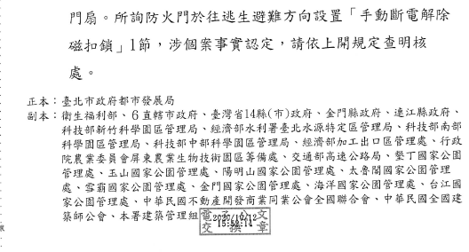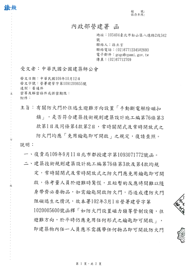 我們回到逃生門的主題,在109年10月12日内政部營建署 函 有關防火門於逃生避難方向設置「手動斷電解除磁扣鎖」是否符合建築法,答案:是否定的。詳述查閱此函文。